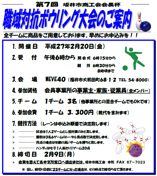 坂井市商工会トップ > お知らせ・活動報告 > 商工会 > 職域対抗ボウリング大会のご案内 職域対抗ボウリング大会のご案内 日頃は商工会の活動にご理解、ご協力をいただき誠にありがとうございます。商工会会員交流イベント 「第7回 坂井市商工会会長杯 職域対抗ボウリング大会」 を下記のとおり開催いたします。他事業所との混合チームでも参加OK です。スコアなど気にせず、お気軽にご参加ください!みなさまのご参加を心よりお待ちしております。 参加お申込用紙はこちらから