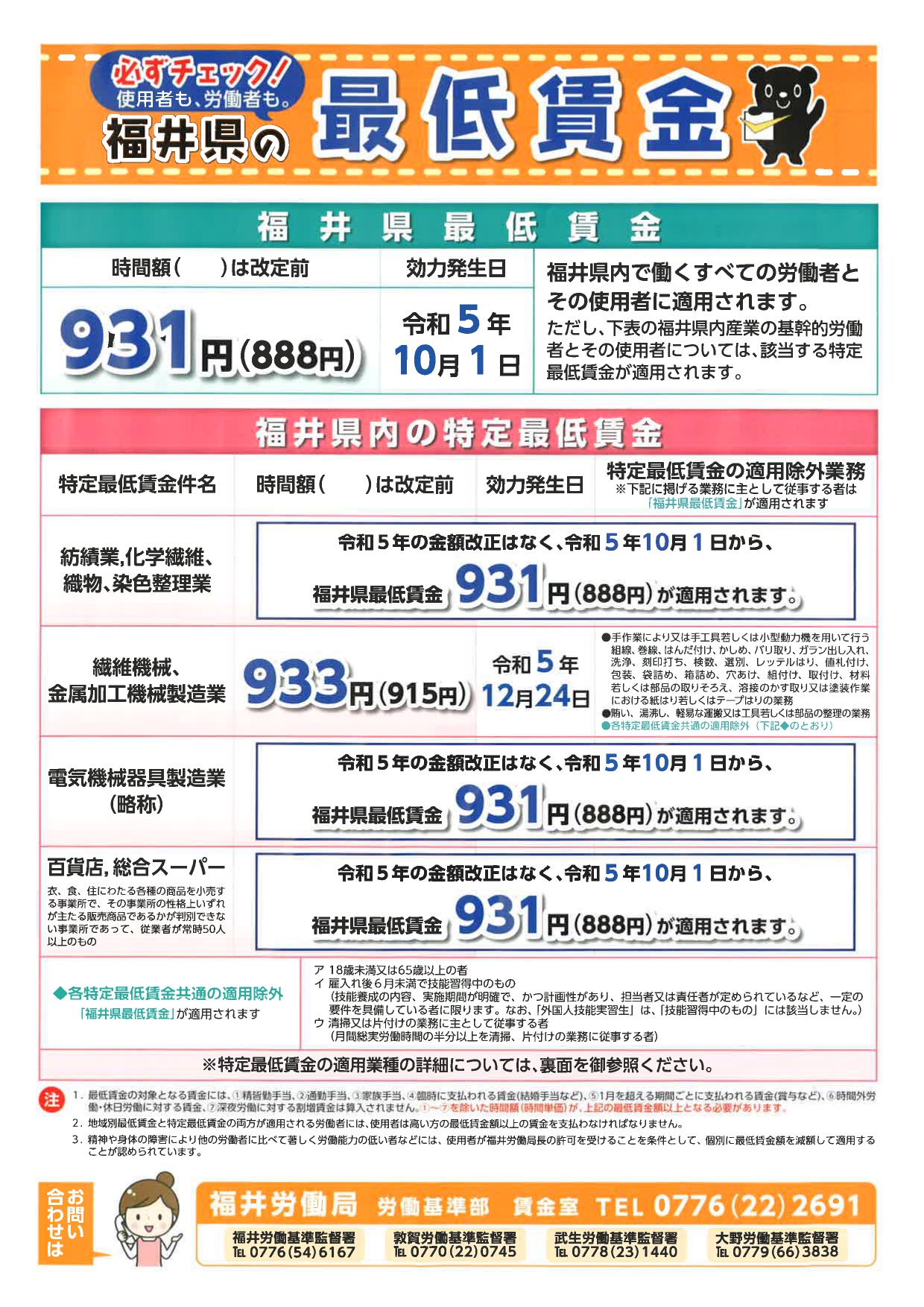 この度、福井県特定最低賃金の4業種のうち「繊維機械、金属加工機械製造業」について、令和5年12月24日(日)をもって、時間額933円に引き上げられました。